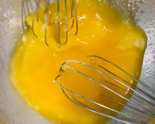 3.Đánh tan trứng trong 1 cái tô lớn rồi thêm vanilla, đường,bơ chảy trộn đều.