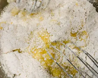4.Thêm chuối đã nghiền vào (1) sau đó thêm bột mì tiếp tục trộn đến đều là được.