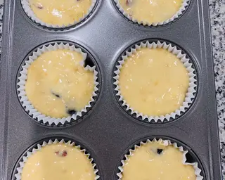 5.Lót giấy cup cake vào khuôn muffin và quét lớp bơ vào khuôn bánh mì. Sau đó đổ khoảng 3/4 hỗn hợp bột vào mỗi khuôn rồi đem nướng.