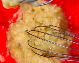 4.Thêm chuối đã nghiền vào (1) sau đó thêm bột mì tiếp tục trộn đến đều là được.