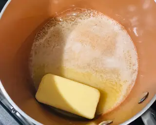 3.Đánh tan trứng trong 1 cái tô lớn rồi thêm vanilla, đường,bơ chảy trộn đều.