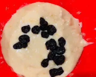 6.Còn cherry khô và nam việt quất có thể trộn chung với hỗn hợp bột luôn cũng được. Riêng bếp đã chia hỗn hợp bột làm 3 phần(cherry, nam việt quất, chuối).