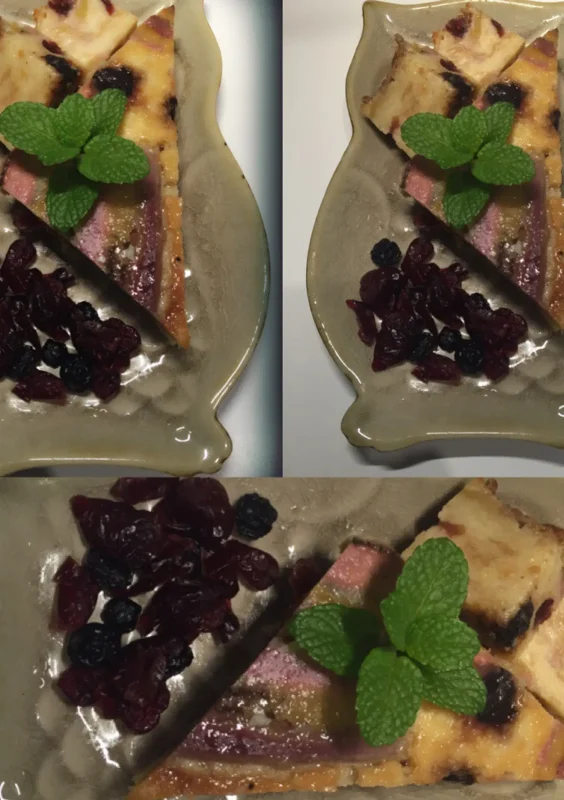 3.Cho bo vao khuon ho nong den khi bo tan chay, sau do xep chuoi va dried cranberries vao khuon roi lan luot 1 lop hon hop banh mi xen ke 1 lop chuoi + cranberries cho den khi gan day khuon.